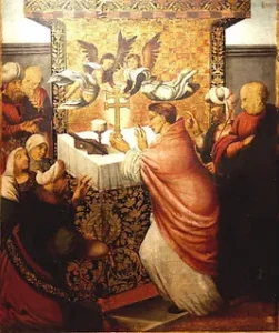 “En Caravaca en el año 1232 estaba en prisión D. Ginés Pérez Chirinos, preso por predicar a Cristo y su Santa Ley entre los musulmanes que en aquella época poseían la ciudad. Un día el Rey moro Ceyt-Abuceyt quiso saber el oficio de cada uno de sus prisioneros. Comparece Chirinos y declara su oficio de sacerdote. Mi deseo, replica el rey, es que desempeñes tu oficio, a mi vista y de mis vasallos. Señor,-dijo- faltan las vestiduras sagradas. Por el camino de Cuenca va un mensajero real, a por los ornamentos que pedía Chirinos, y una vez traídos, D. Ginés se reviste con las vestiduras sagradas y comienza la misa. En el nombre del padre, y del Hijo y del Espíritu Santo. Amén. Entremos en el altar del Señor pronuncia conmovido Chirinos. Quiere rezar el Gloria y sus labios se humedecen, su rostro se altera, su espíritu se inquieta. Díjole el Rey ¿qué le pasa Chirinos? Mi señor, falta la Santa Cruz, sin ella no puedo continuar mi oficio. Levanta el Rey sus ojos y en ese momento ve a dos ángeles (que significa enviados) que bajan un objeto entre sus manos, y dijo el rey ¿es la Santa Cruz, eso que bajan los ángeles? Chirinos contesta sí, mi señor, cae de rodillas, la toma en sus manos y continua la misa hasta su fin. La Cruz Patriarcal que los ángeles llevaron a Caravaca (Murcia), triunfó en el corazón del Rey moro, al ver el milagro el Rey moro pide a Chirinos el bautismo y D. Ginés derrama el agua del bautismo sobre la cabeza real. Los vasallos llaman a su Rey desde entonces D. Vicente, más tarde tanto su esposa como sus dos hijos que tenían se convirtieron al cristianismo, he aquí el verdadero milagro.”