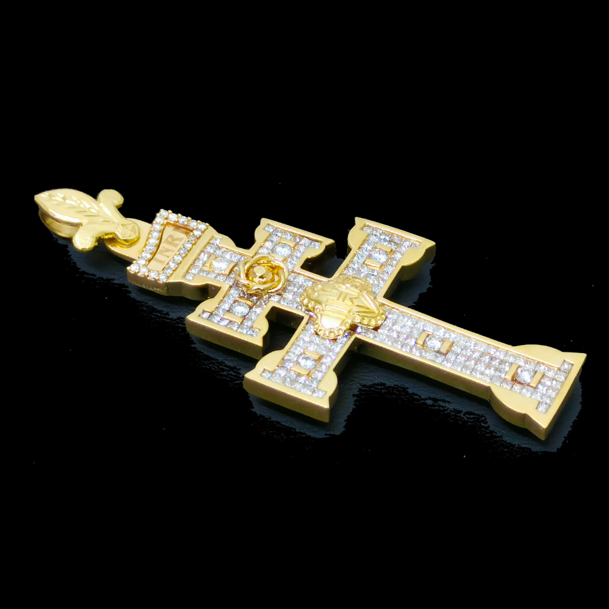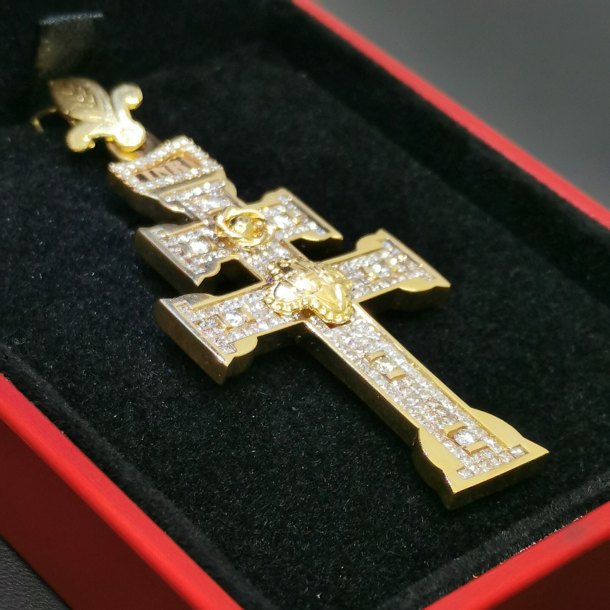 Cruz de Caravaca fabricada en oro de primera ley 18 Kilates 750ml. Repleta de Brillantes