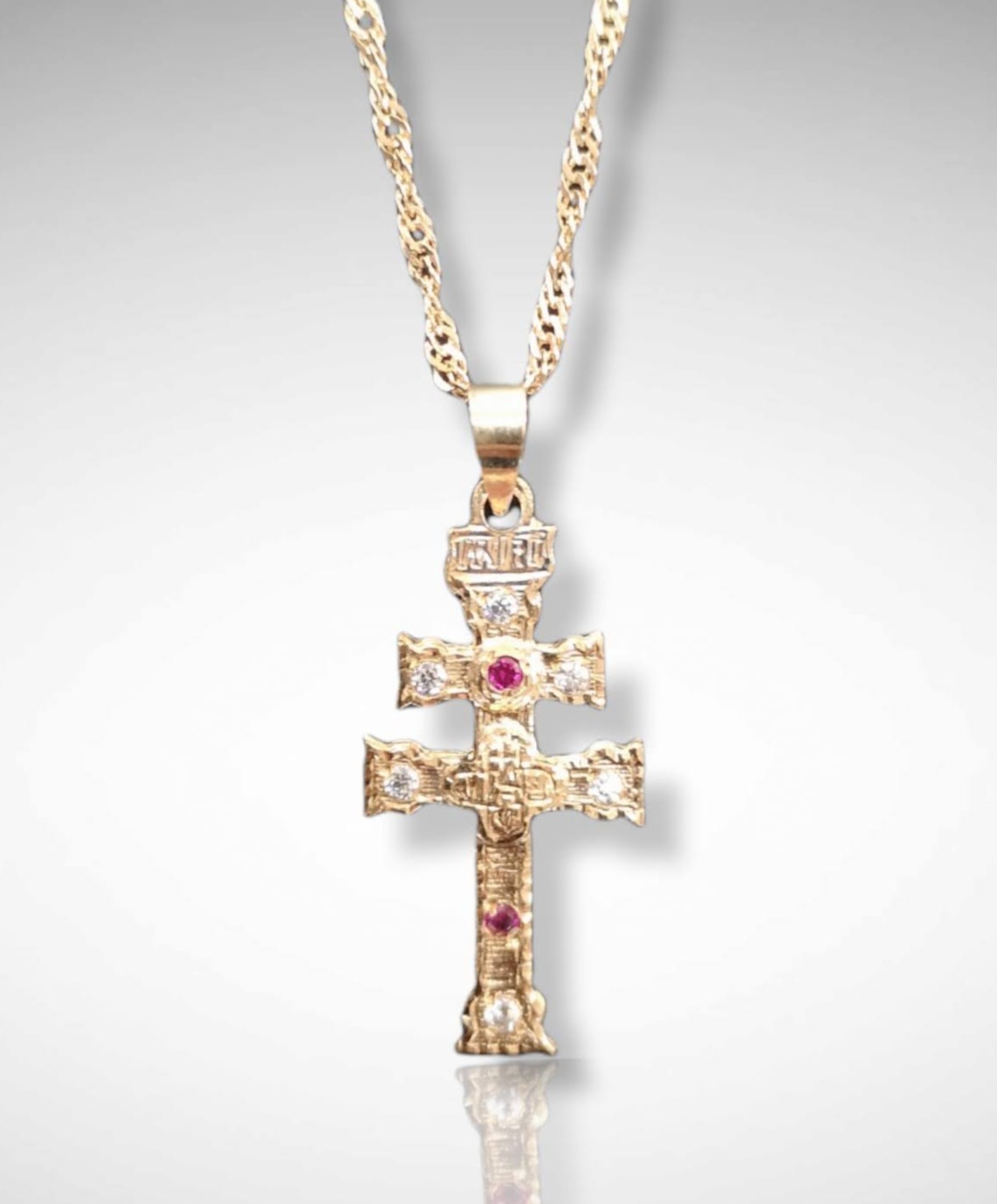 Colgante de la Cruz de Caravaca en Oro de Primera Ley, con circonitas Roja y Blanca.